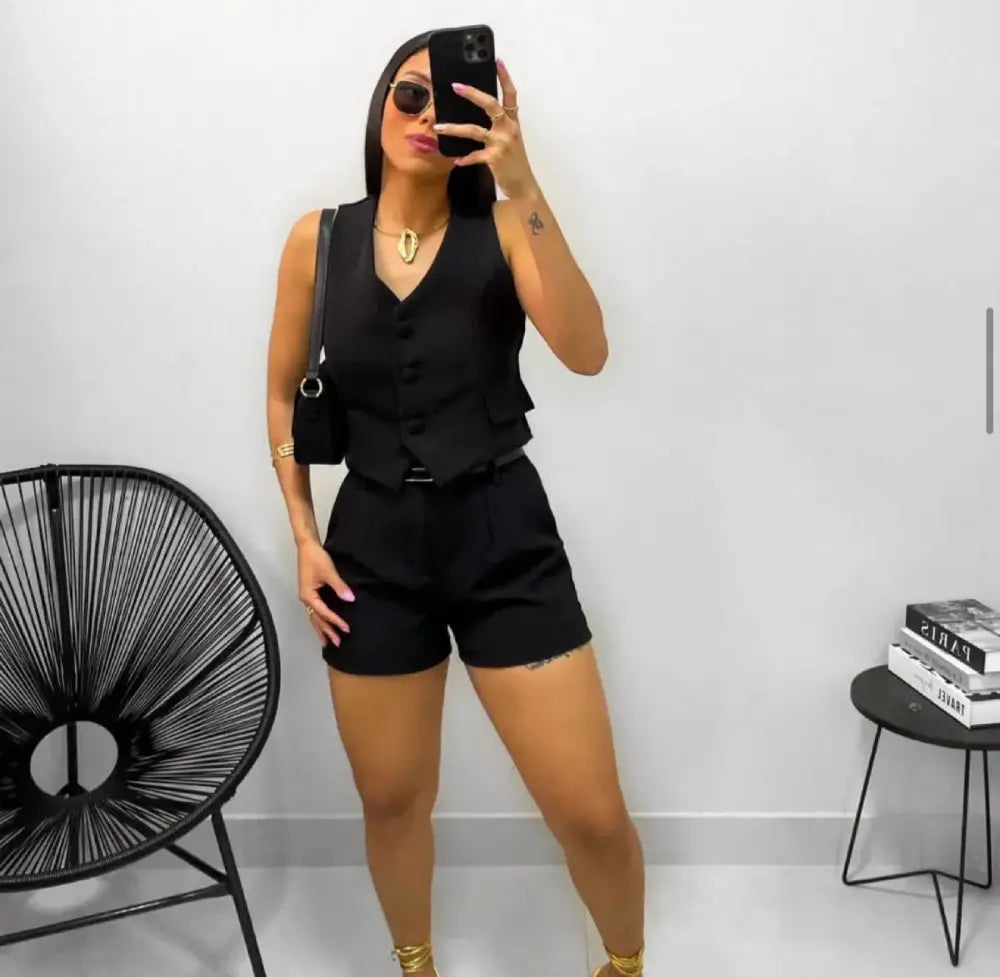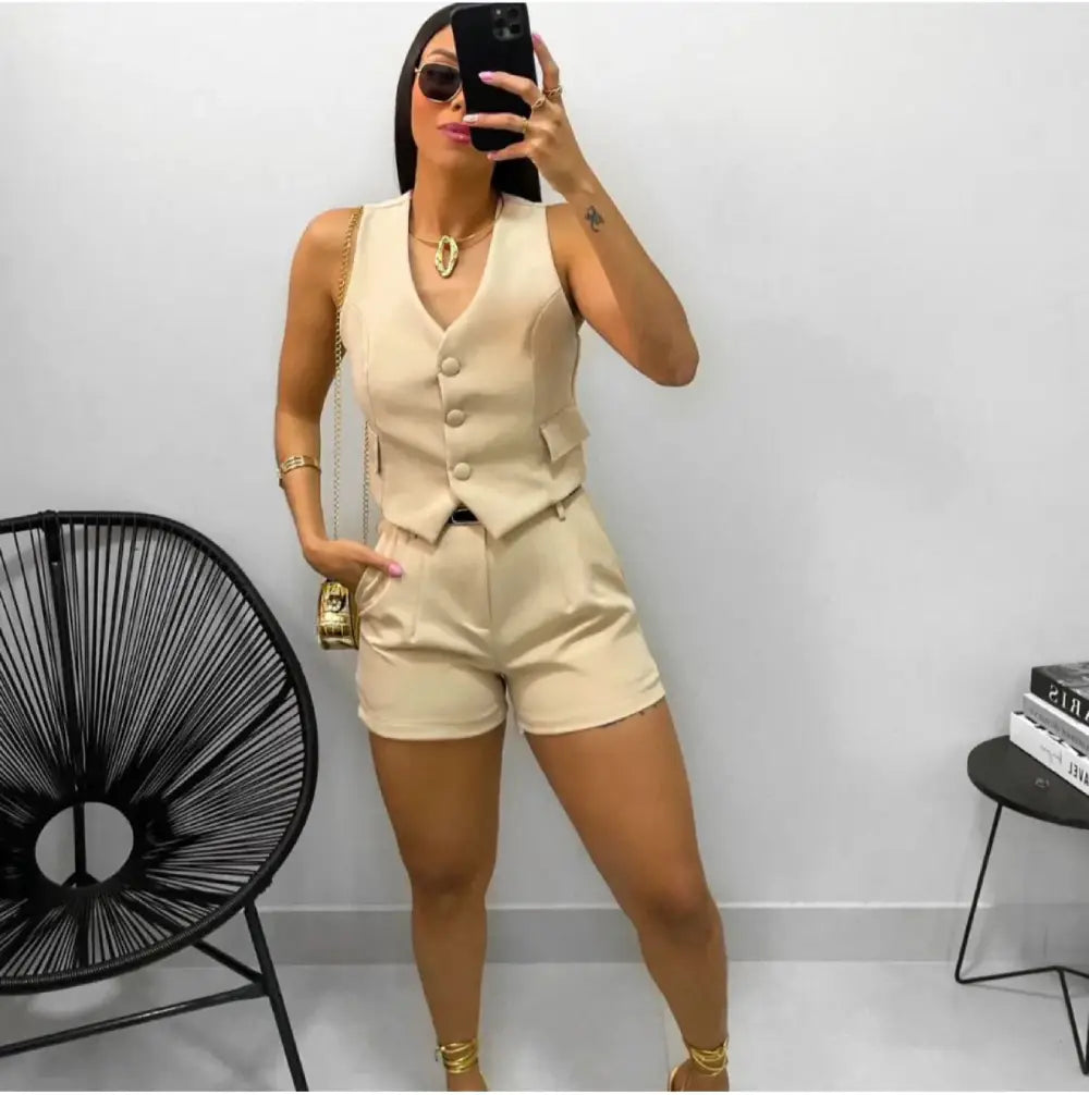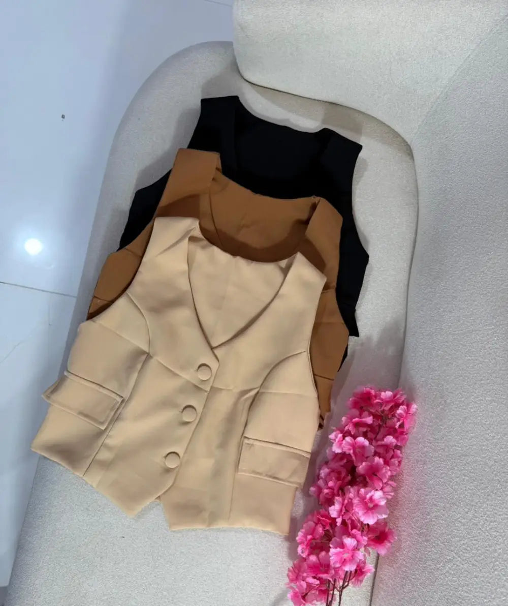 Colete alfaiataria feminino, estruturado com recorte elegante e fechamento frontal por botões. Possui bolsos decorativos que trazem charme ao visual, sendo uma peça versátil para composições modernas e sofisticadas. Disponível em cores clássicas como bege, caramelo e preto, pode ser usado sozinho ou em conjunto com shorts ou calças, criando looks estilosos para diversas ocasiões.