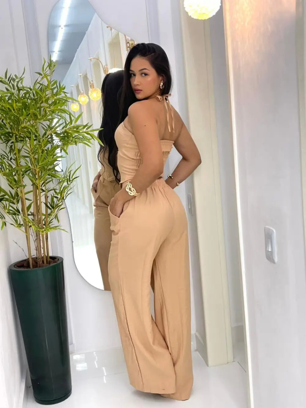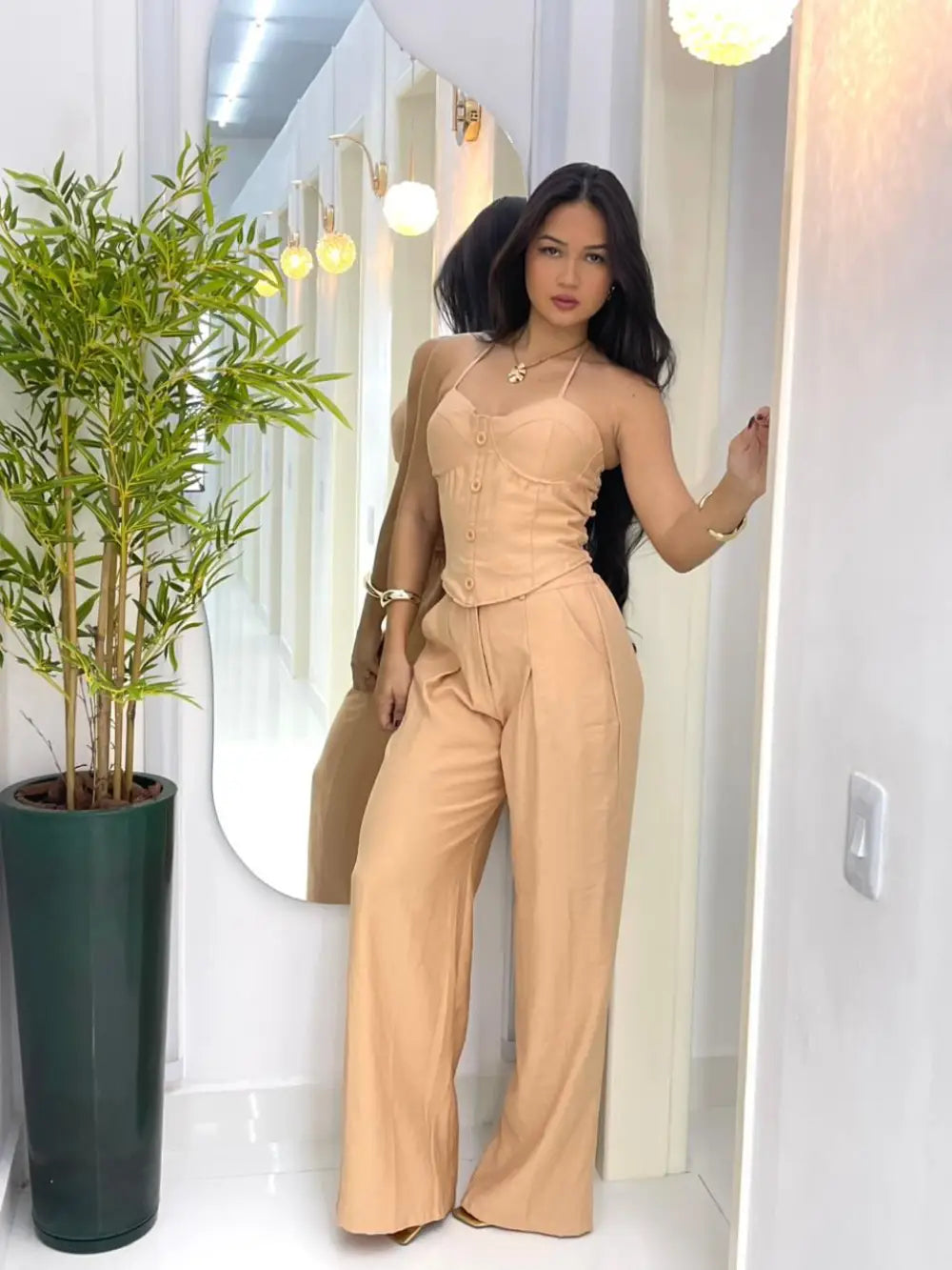 Conjunto longo de luxo com caimento impecável e tecido sofisticado.