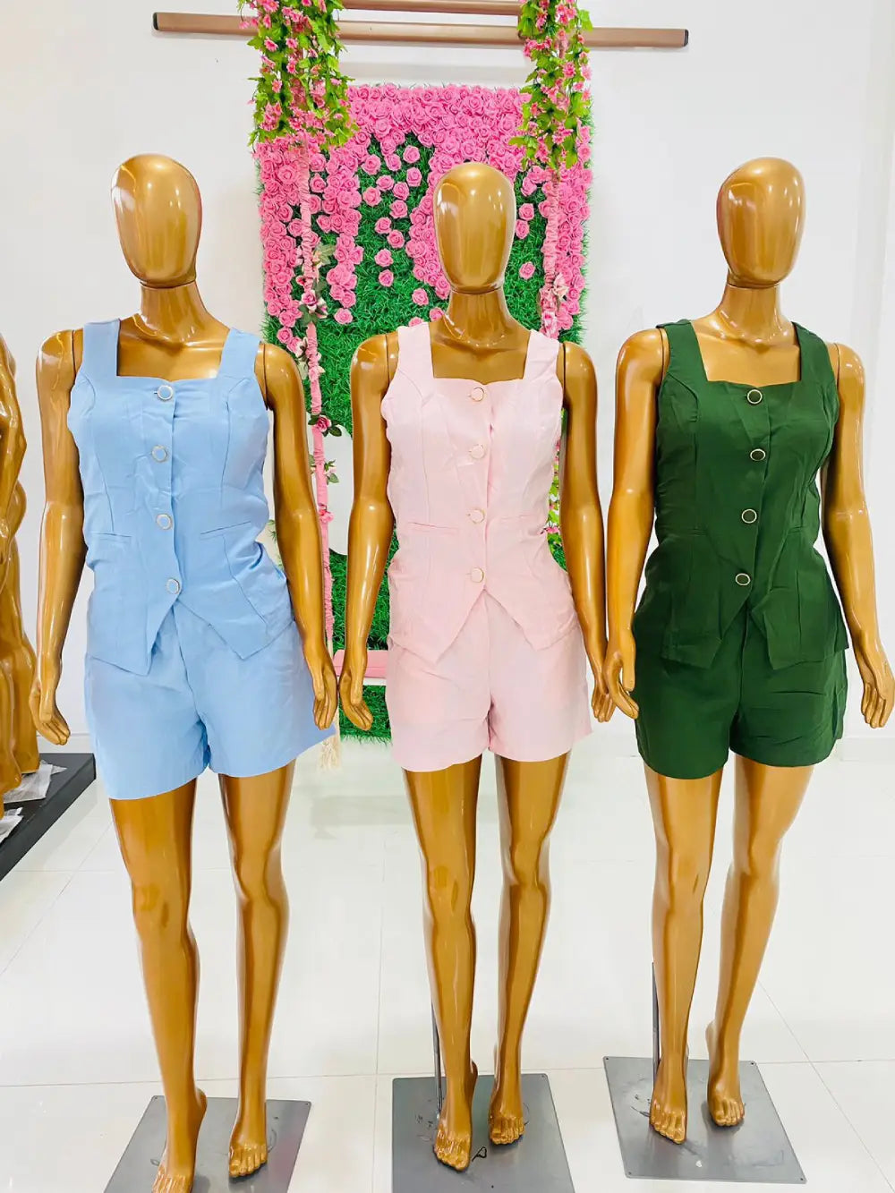 Conjunto feminino com colete estruturado e short alfaiataria.