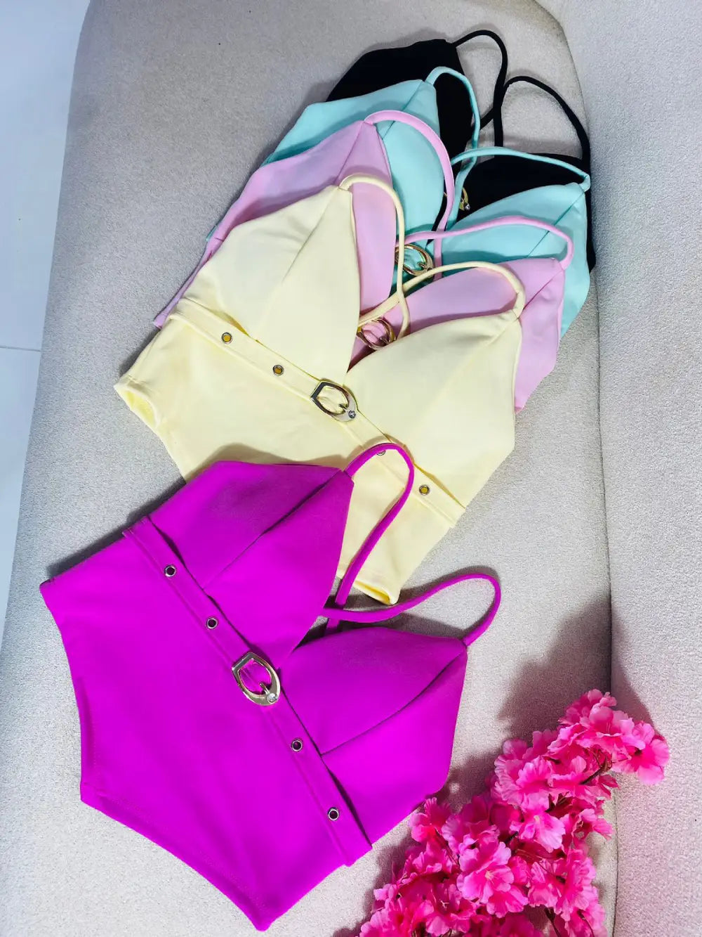 Top cropped feminino com alças finas e detalhe de fivela metálica na cintura.