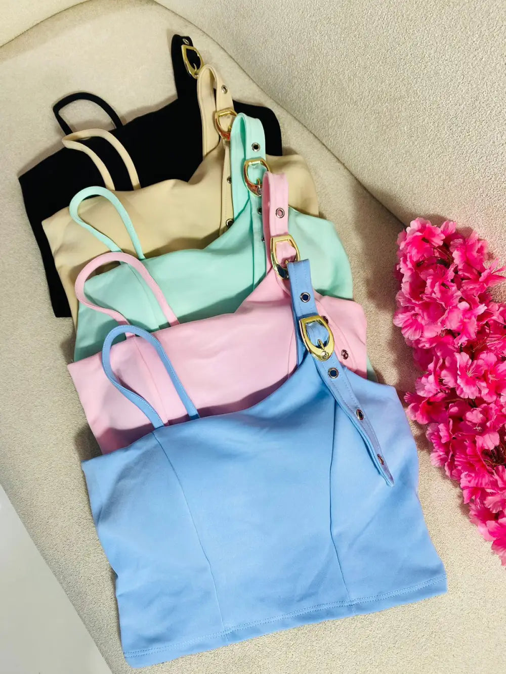 Top cropped feminino em malha canelada com alça assimétrica e detalhe de fivela dourada.