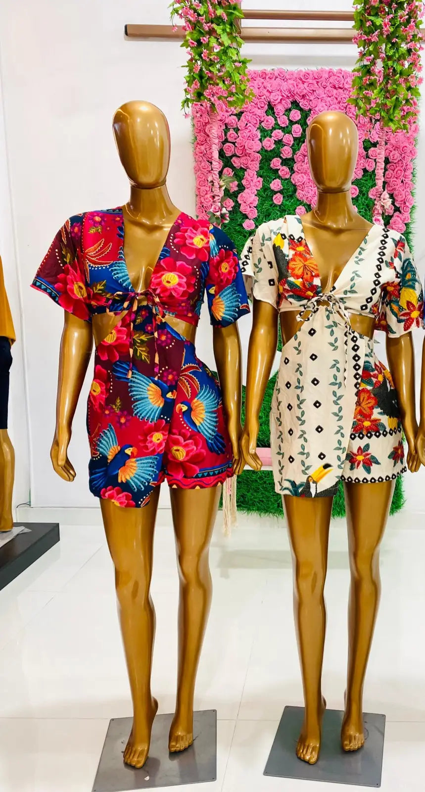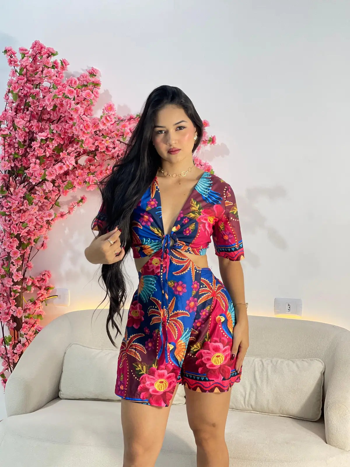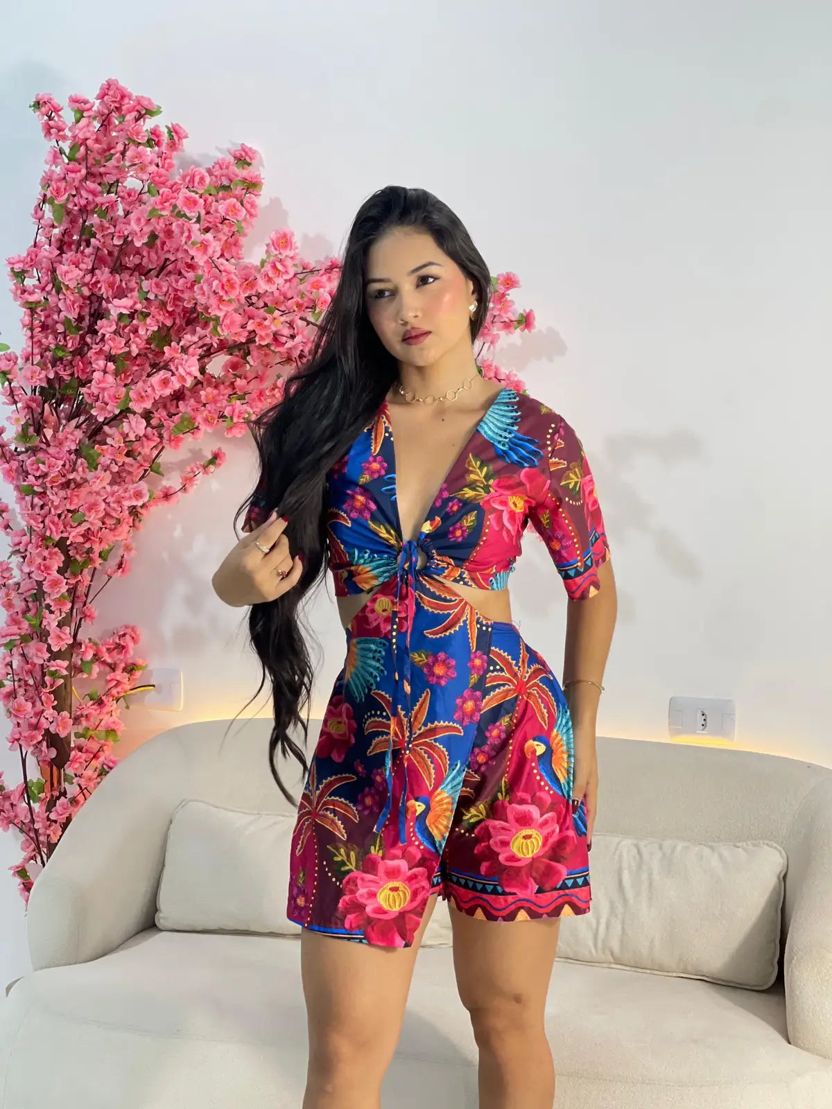 Macaquinho estampado feminino, confeccionado em tecido leve e confortável, perfeito para dias quentes e ocasiões casuais. Possui decote em V profundo com amarração frontal, recorte na cintura que valoriza a silhueta e mangas curtas que garantem frescor e liberdade de movimento. A estampa tropical colorida traz um toque vibrante e moderno, ideal para quem gosta de se destacar com estilo. Disponível em diferentes cores e padrões, é a escolha perfeita para passeios, encontros e momentos descontraídos.