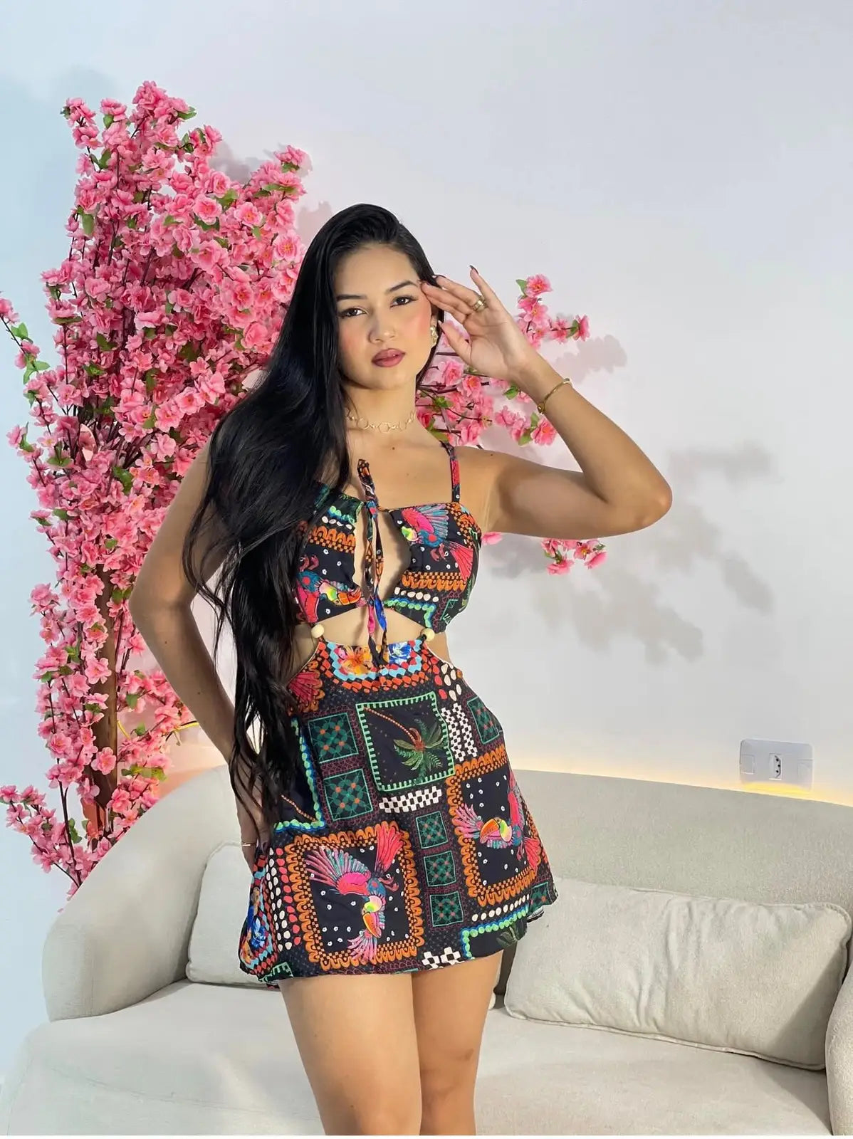 Macaquinho Vestido Estampado com recortes laterais e amarração frontal, unindo charme e conforto em uma única peça. Possui modelagem soltinha na saia e estampa tropical vibrante com detalhes de pássaros e folhagens, perfeita para dias quentes e ocasiões casuais. As alças finas ajustáveis e o detalhe aberto nas laterais garantem um visual moderno e sensual, sem perder a leveza. Confeccionado em tecido leve e macio, oferece liberdade de movimento e frescor para o dia a dia.