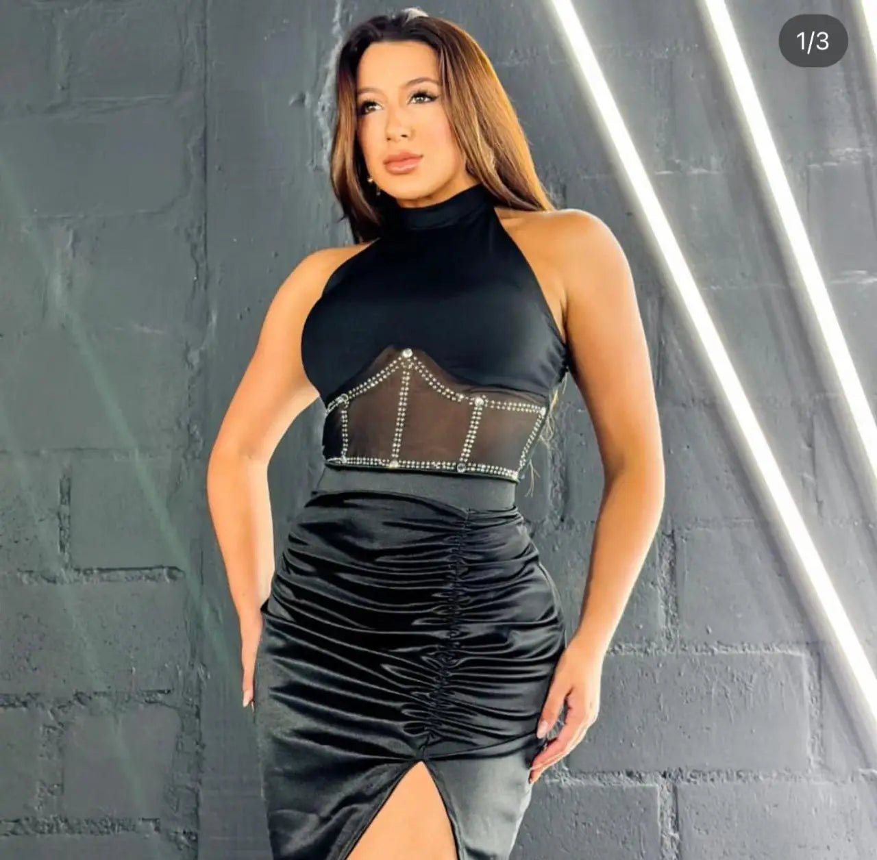 Um look marcante e sofisticado para mulheres que querem dominar o ambiente com elegância e poder. A combinação da saia preta de fenda lateral com o top estruturado estilo couro cria uma silhueta ousada, feminina e extremamente estilosa. Ideal para festas noturnas, eventos especiais ou aquele jantar que pede um visual memorável.
