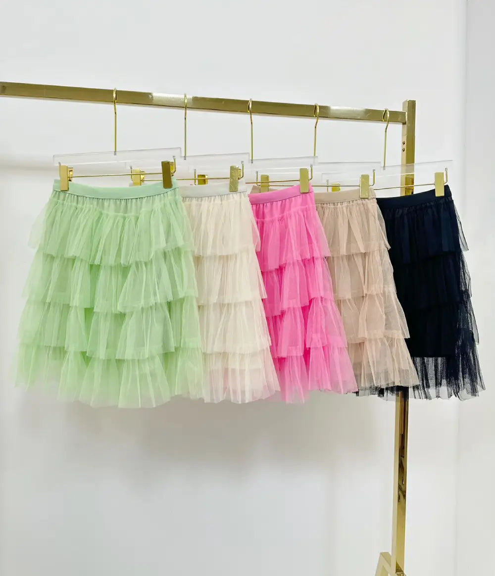 Saia curta em camadas de tule, com babados delicados que trazem leveza e estilo ao look. Disponível em cores vibrantes e neutras, é uma peça versátil para diversas ocasiões. Ideal para composições modernas e cheias de personalidade.
