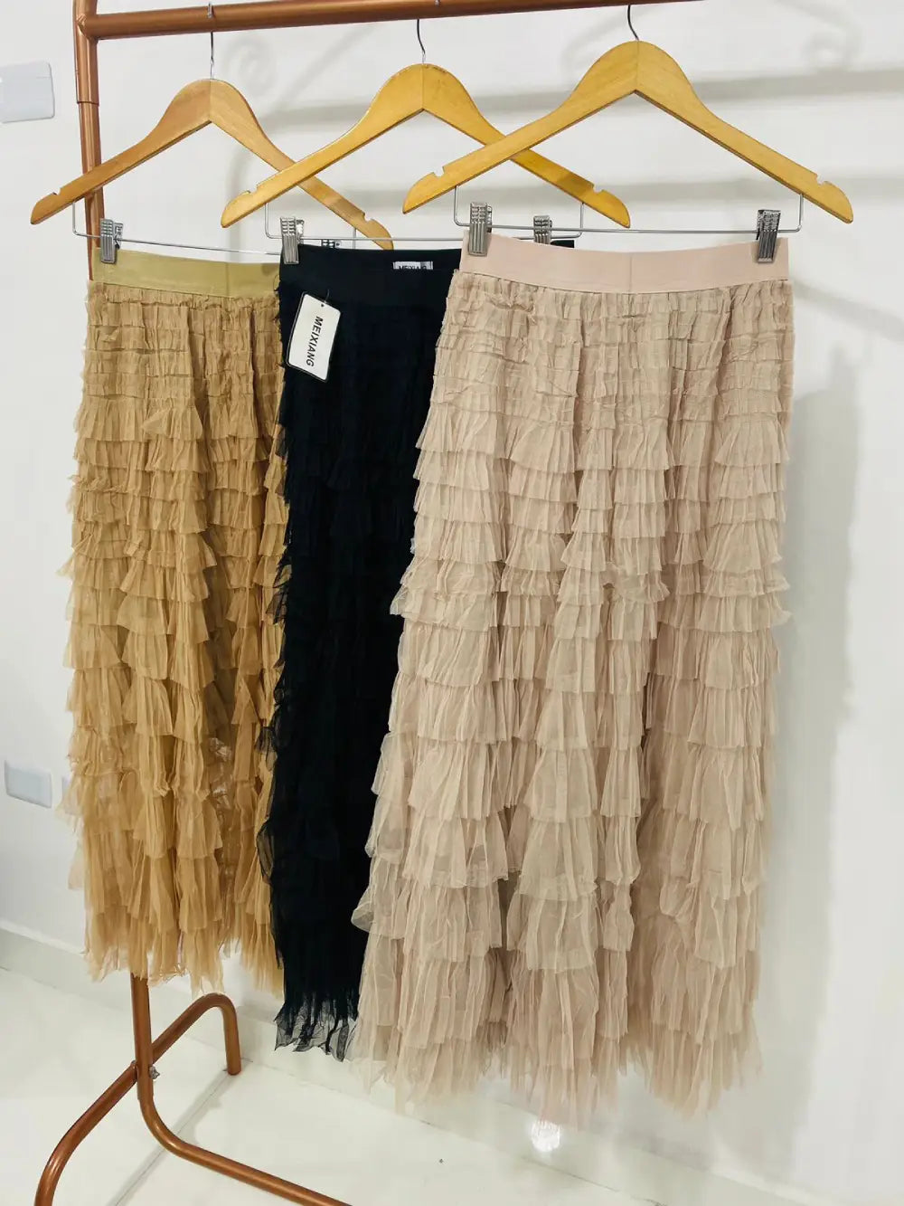 Saia midi em camadas de tule, com babados delicados que trazem movimento e sofisticação. Disponível em cores neutras e versáteis, é perfeita para compor looks modernos e elegantes. Ideal para ocasiões especiais ou para dar um toque romântico ao dia a dia.