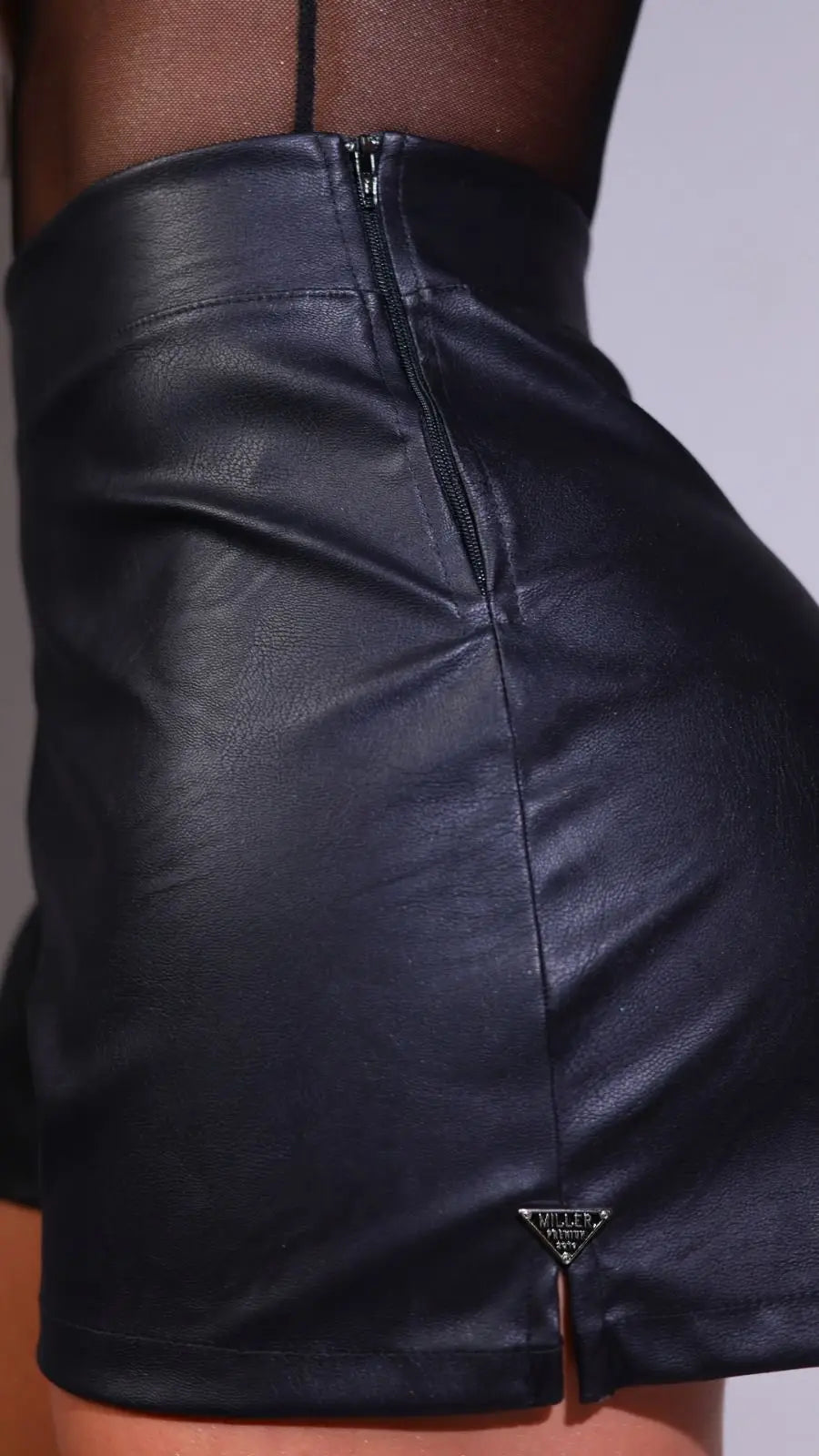 Short de couro sintético Miller, moderno e sofisticado, perfeito para compor looks ousados e elegantes. Com modelagem de cintura alta, recorte lateral e detalhe em plaquinha metálica exclusiva da marca, proporciona caimento impecável e realce das curvas. Possui fechamento lateral por zíper invisível e acabamento premium, ideal para ocasiões que pedem estilo e atitude.