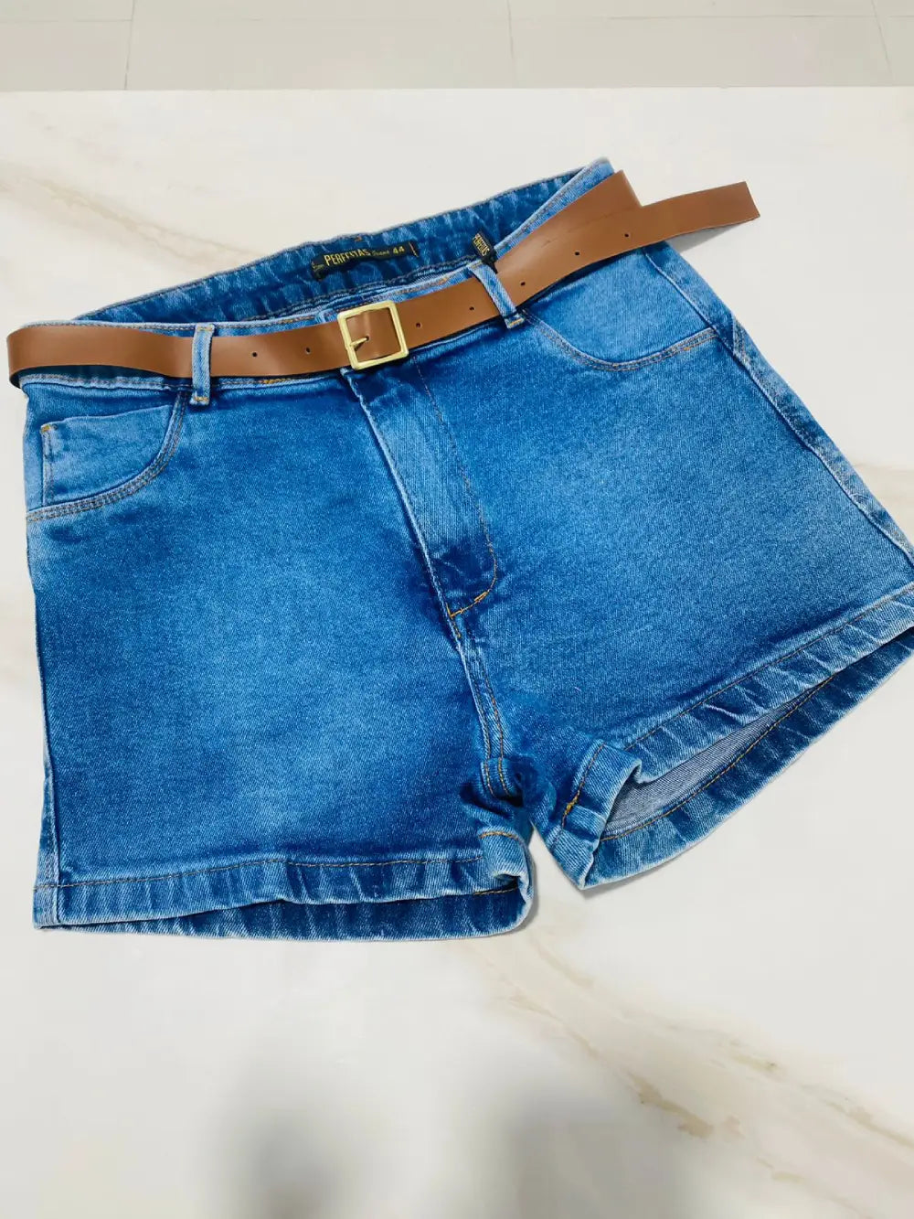 Short jeans feminino da marca Perfeitas Jeans, modelagem moderna e confortável. Confeccionado em denim azul, possui bolsos funcionais e fechamento em zíper e botão. Peça versátil, ideal para compor looks casuais e despojados.