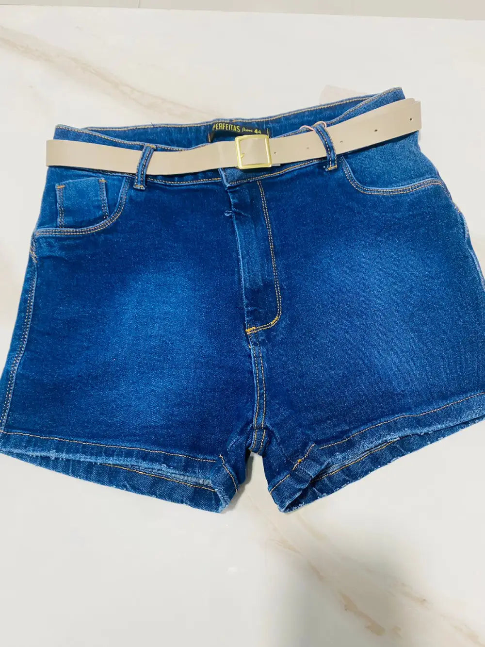 Short jeans feminino da marca Perfeitas Jeans, modelagem moderna e confortável. Confeccionado em denim azul, possui bolsos funcionais e fechamento em zíper e botão. Peça versátil, ideal para compor looks casuais e despojados.