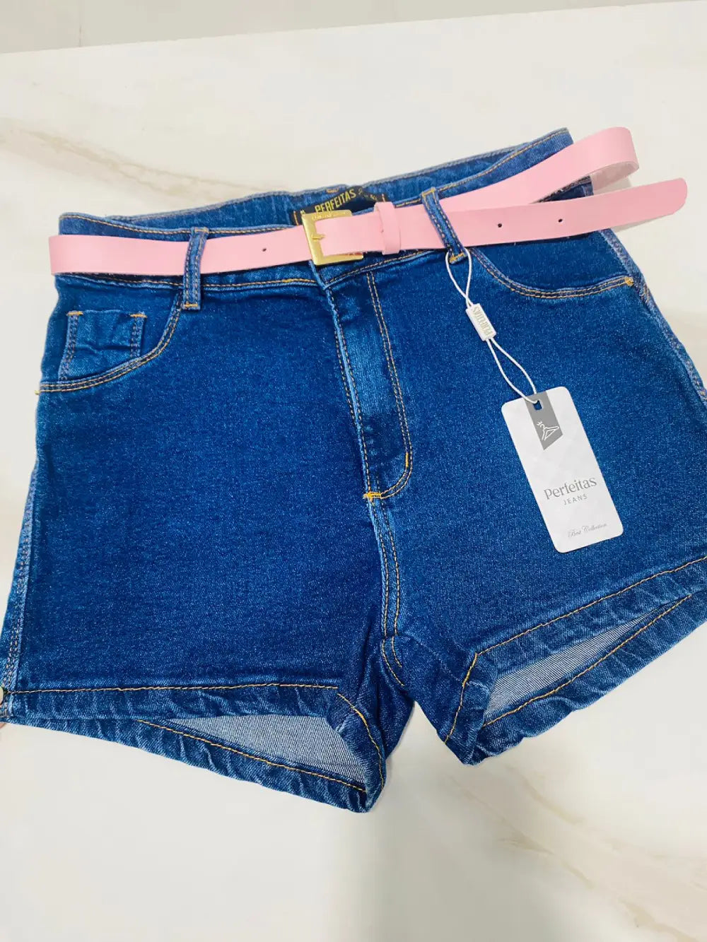 Short jeans feminino da marca Perfeitas Jeans, modelagem moderna e confortável. Confeccionado em denim azul, possui bolsos funcionais e fechamento em zíper e botão. Peça versátil, ideal para compor looks casuais e despojados.