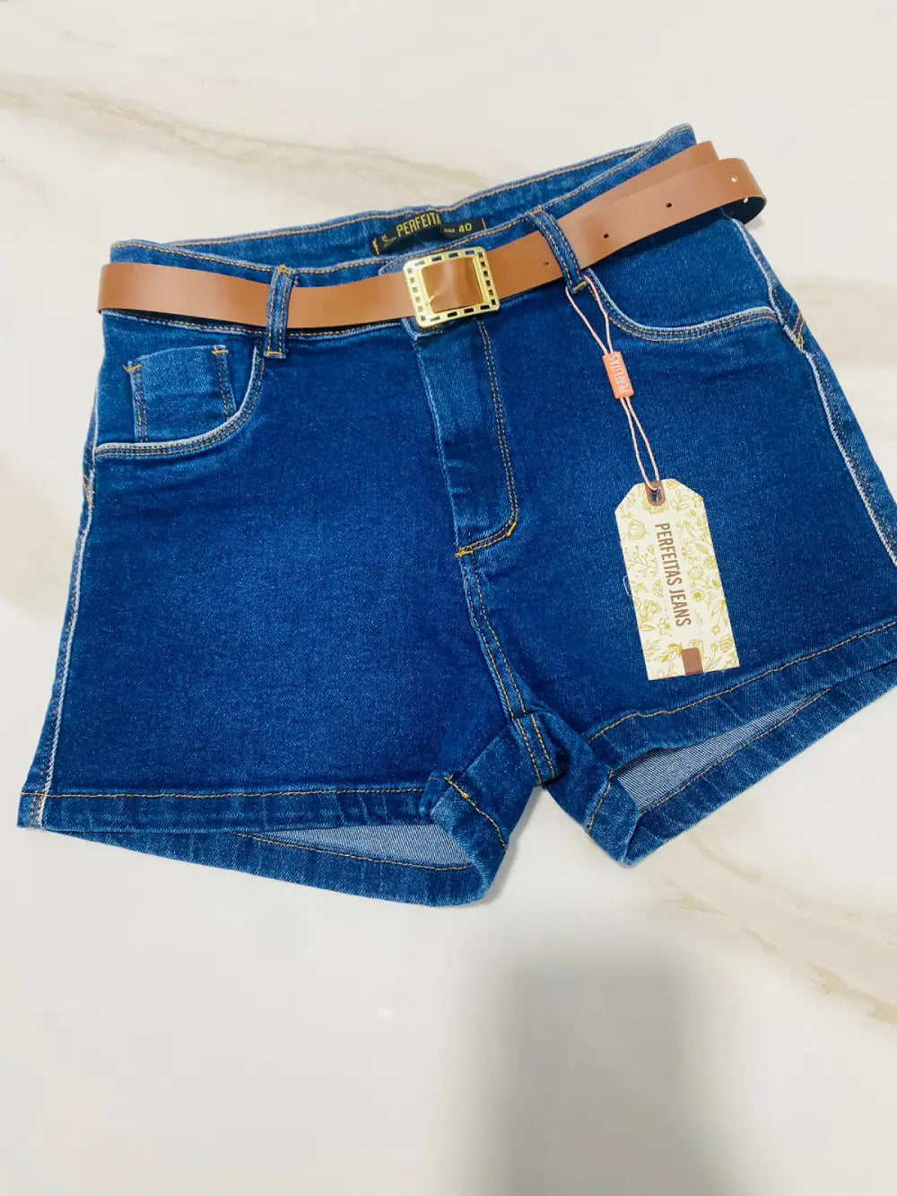 Short jeans feminino da marca Perfeitas Jeans, modelagem moderna e confortável. Confeccionado em denim azul, possui bolsos funcionais e fechamento em zíper e botão. Peça versátil, ideal para compor looks casuais e despojados.