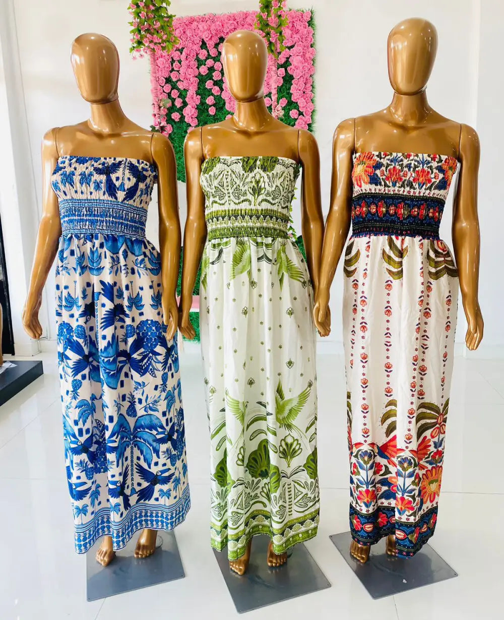 Vestido longo tomara que caia com estampa étnica vibrante.