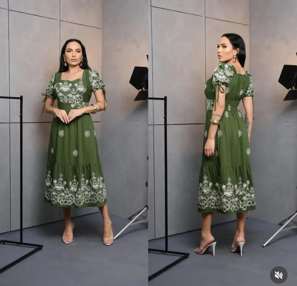 Vestido midi com bordados brancos, trazendo elegância e sofisticação.